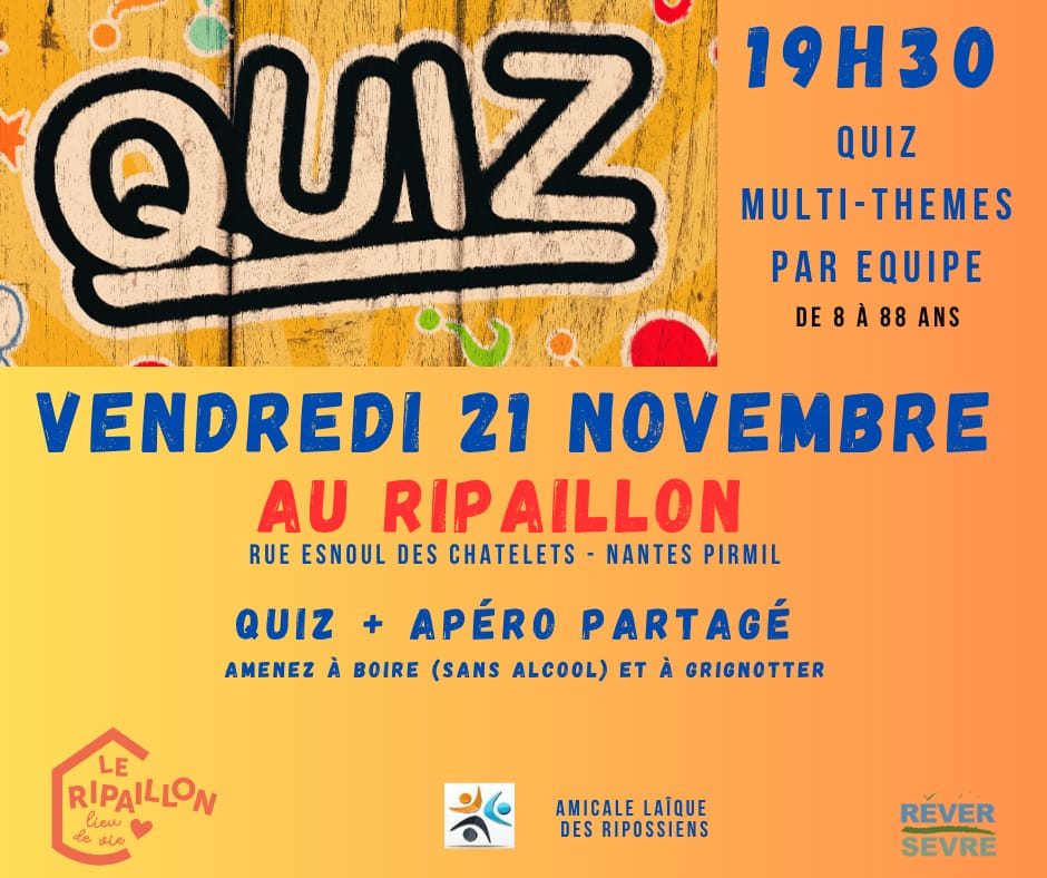 si vous êtes dans le coin, dispos et intéressés, ce vendredi 21 novembre c'est QUIZ + apéro partagé au Ripaillon